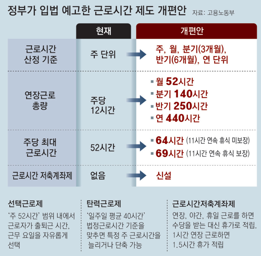고용노동부는 주 12시간으로 연장근로 시간을 월, 분기, 반기, 연 단위로 운영할 수 있도록 허용하는 매용을 근로시간 개편안으로 발표했다. 이 내용은 추에 최대 69시간 근무하고 후에 몰아서 쉴 수 있도록 한다는 내용이었다.