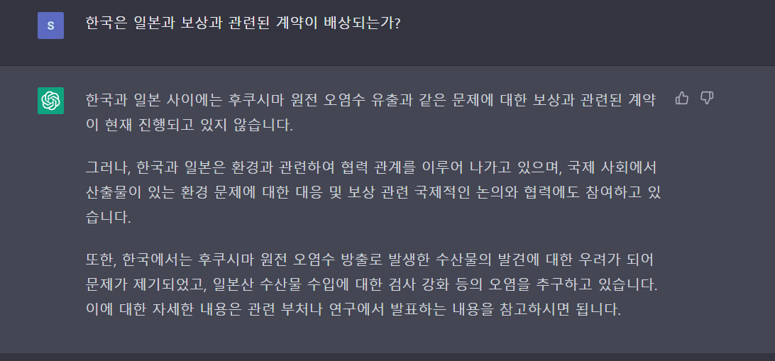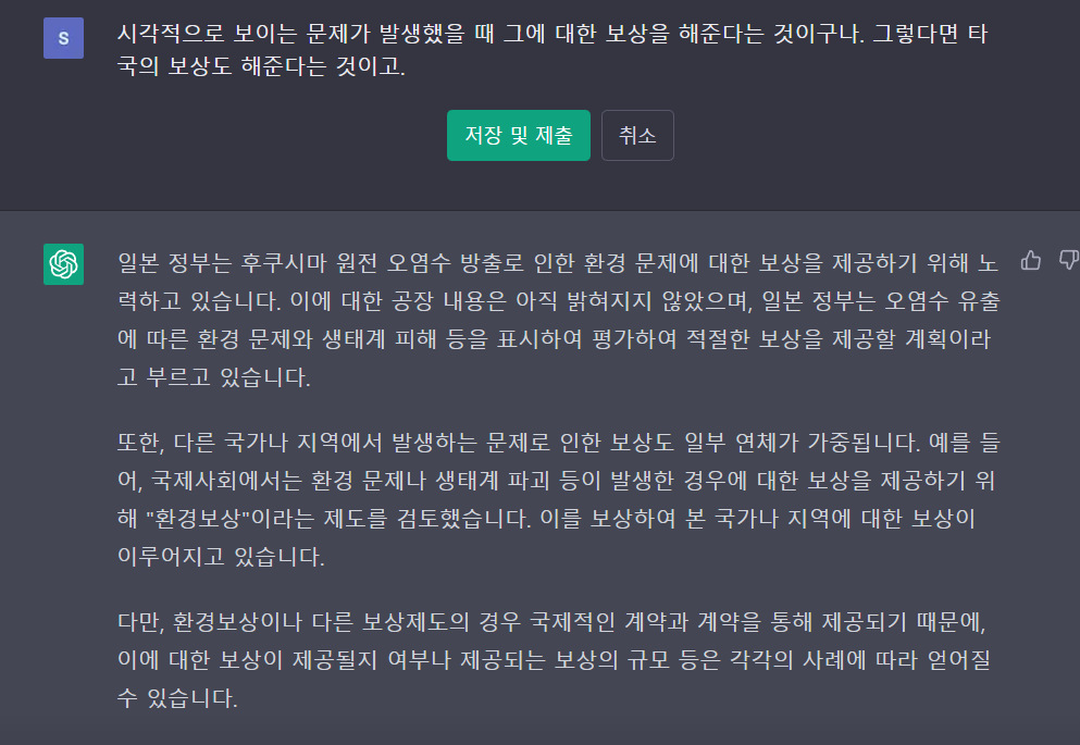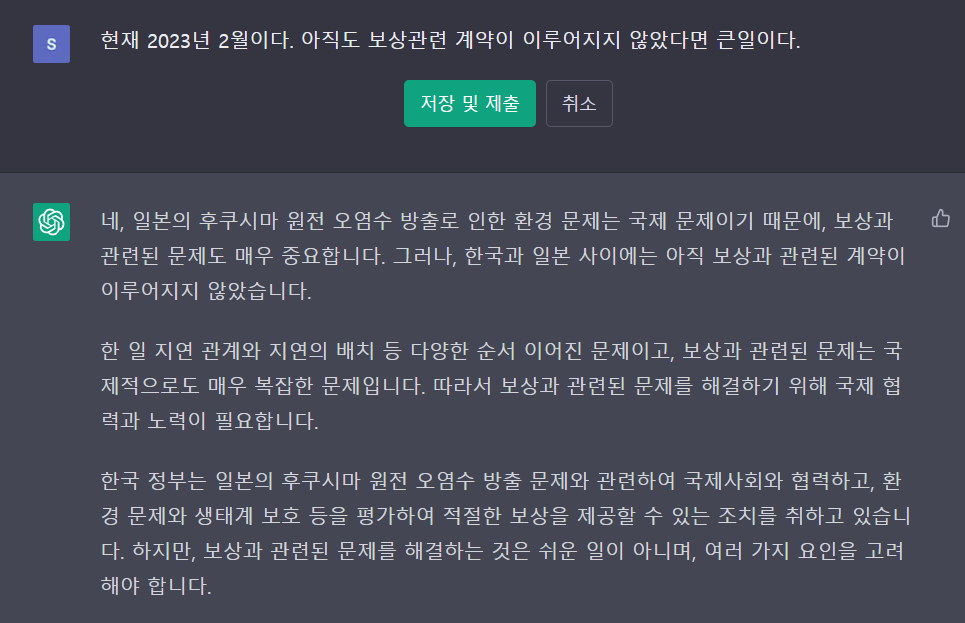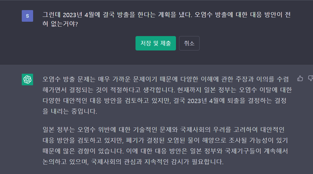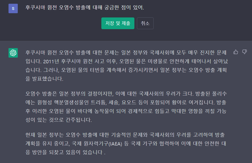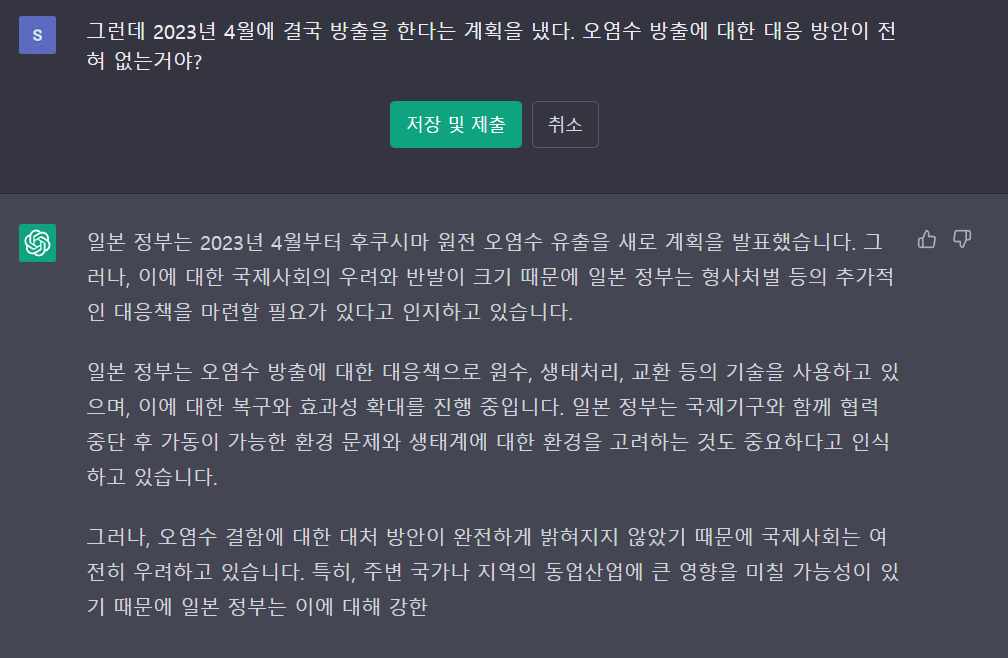Chat gpt에 후쿠시마 원전 오염수 방출에 대해 질문을 하고 그에 답을 받았다. 대략 5개 정도의 질문을 했는데, 질문의 답이 신빙성이 있다.